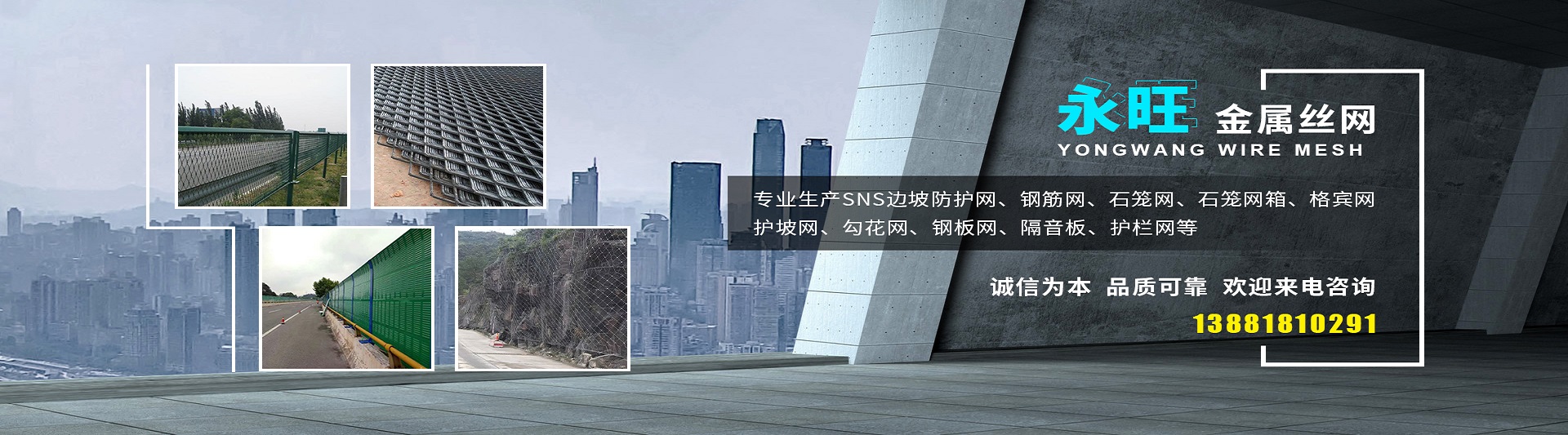 成都市永旺金屬絲網有限公司是一家研發(fā)、生產、加工、銷售為一體的責任制企業(yè)公司。本公司“以誠信為本、以服務社會已任、以科學創(chuàng)新為理念”。 專業(yè)生產SNS邊坡防護網、鋼筋網、石籠網、石籠網箱、格賓網、護坡網、勾花網、鋼板網、隔音板、護欄網等。產品主要運用于鐵路,高速公路,橋梁,隧道,機場,礦山,河道,球場,碼頭,港口等多個領域。 本公司期待與您長期合作,希望與您共創(chuàng)輝煌,我們愿與各業(yè)朋友精誠合作,共創(chuàng)美好未來,希望各業(yè)朋友來函來電